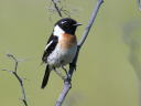 車を停めたすぐ横のバラ線の支柱に、降りてきた♂です。2本程度先の支柱にもエサを咥えた♀がとまったまま動かずで、この場で営巣中なのかと慌てて動かした次第です。この時期、この程度の風切羽の色合いならば成鳥判断で大丈夫なようです。 |
