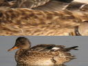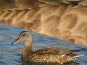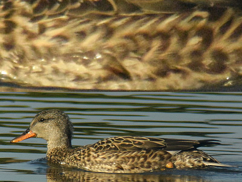 第1回冬羽換羽中個体の幼羽は通常側面体羽最上段に残るのですが、この個体は下段のほうに擦れきった幼羽が残っているように見えています。幼羽雨覆が広く写っていますが栗色褐色斑は皆無で、おそらくは♀幼鳥で |
