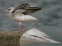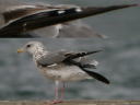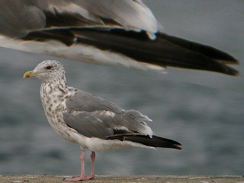 | シロートの一言。 第2回夏羽→第3回冬羽移行中くらいかなと。。。 成鳥としか思えないクチバシにずいぶん班が多い個体で、当初はセグロカモメだと思っていたのですが、写真にはかなり黒に近い大雨覆暗色帯が写っていました。割りとスマートな体つきですし、タイミルなのだろうと判断を改めました。その上で下写真でわかりますが羽先無班の初列は白斑つきの新羽初列に換羽中ですから、もちろん成鳥ではなく、第3回冬羽換羽中なのだろうと判断です。 |