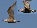 飛翔写真上面です。奥目がちなきつい顔と、大雨覆の暗色帯・褐色の初列風切が目立っています。ただしこの暗色帯を持たないオオセグロもある程度普通にいますから。。。 |