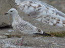 上個体のようなグレーの肩羽はまだ持ちませんが、白い地色で大雨覆に暗色帯もなく、白いセグロカモメのように見えるこの外見はモンゴルのはずです。