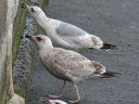 たまたま並んでいた、第1回冬羽と第2回冬羽のセグロカモメです。肩羽の違いはもちろんですが、初列風切も第1回冬羽はまだ褐色の幼羽で、第2回冬羽は前年秋に初めての換羽を終えた羽先白斑がない黒い羽です。 |