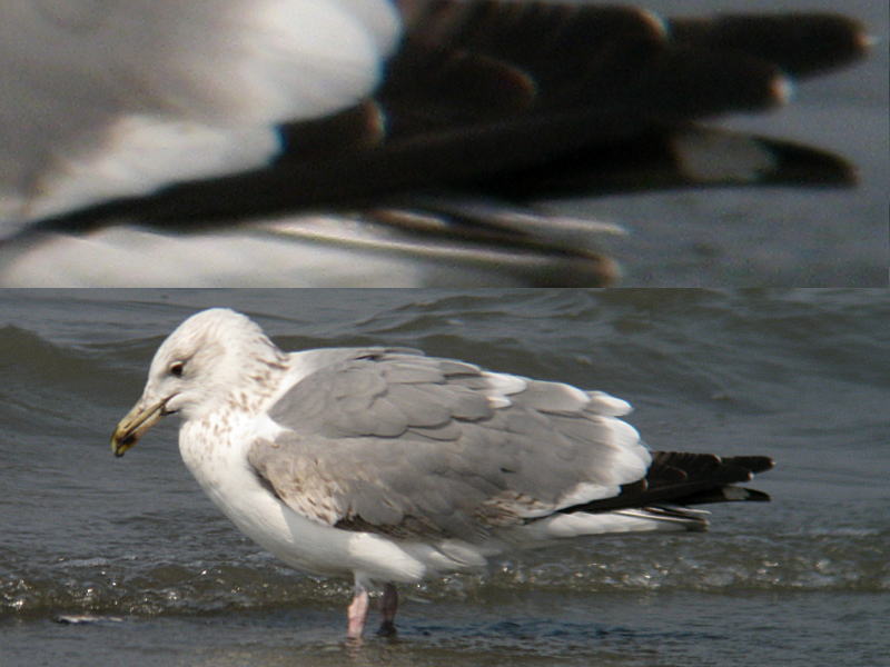 | シロートの一言。 第3回冬羽→第3回夏羽移行中です。 旧羽雨覆がずいぶん多いのですが、肩羽・三列には成羽が多く、一見羽先白斑がない第2回のように見える初列にもP10のミラーが右翼裏側に透けて見えているのではと思えるやや大きめな白斑が写っています。一旦はタイミルではとしていた個体ですが、僅かに見えている大雨覆の班やこの頸から胸元の班は普通のセグロ(ベガ)なのではと判断を訂正しました。 |