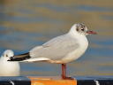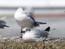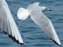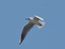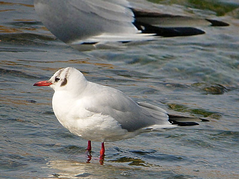 | シロートの一言。 成鳥冬羽→夏羽移行中です。 頭部から顔にかけて黒条が2本出てきています。夏羽換羽が始まったばかりの個体ですが、大半のユリカモメたちはこれくらいの換羽状況で日本から離れていきます。そして初列風切換羽も始まっているようで、伸張中の初列羽先には白斑がついています(ハッキリしてますから前年からの白斑ではないはずです)。 |