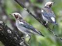 | シロートの一言。 幼羽→第1回冬羽移行中(後期)のはずです。 殆どの肩羽は換羽なっていますが、写真で見える限りでは左側外縁部に2枚、そして外側大雨覆に数枚の旧羽をまだ纏っているのがわかります。なお、図鑑では幼鳥クチバシは基部が肉色と記されていましたが、成鳥でも冬羽時のクチバシ基部はやや青味がかった淡色になっています。クチバシだけでの、第1回冬羽換羽が進んだ若鳥と成鳥冬羽の識別は難しそうです。。。 |