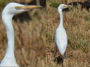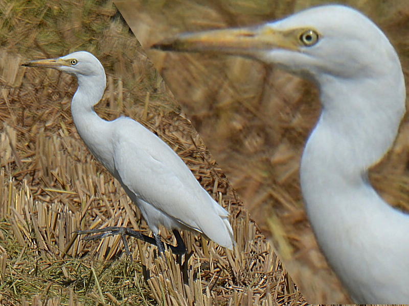 | シロートの一言。 おそらくは幼鳥なのではと。。。 夏羽時黒く染まることがないアマサギのクチバシは冬羽時も先端まで黄色ですが、この個体は上クチバシ基部から淡く黒ずんでいて、チュウサギ的に見えてしまいます。しかしアマサギはシラサギ類最小で、フィールではまず間違えることはなく、頸も脚も短く見えます。それが単独写真になってみるとよく似て見えて、写したときの記憶が残っていても本当に判断に迷います。ただしこの太く短く写っている頸はアマサギで大丈夫なはずで、クチバシも土塊で黒ずんでいるわけではなく、雛のとき黒味が強いクチバシだった幼鳥のものなのではと想像です。ネット写真で見た雛はクチバシが黒ずんでいますが、かなり早い時期から黄色くなっている雛もいて、全ての幼鳥クチバシが黒ずんでいるわけではないと思われます。また、より若い幼鳥の場合脚色は黄緑色だそうです。 |