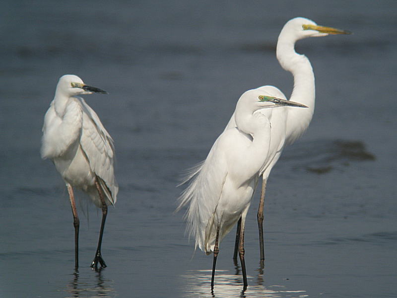 | シロートの一言。 番外です。 長い間オオダイサギとチュウダイサギの大きさ比べで載せていたのですが、見直してみると、脚色は3羽とも夏羽チュウダイサギ程度に写っています。しかも右後ろのオオダイサギだと思っていた個体はまだ冬羽で、仮に大きなチュウダイサギだったとしても脚色だけ先に夏羽変化が起こるものだろうかと。。。かと言ってこの程度の脚色でオオダイサギと言い切る自信もなくで、取り敢えず番外としました。。。(^^; |