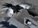静止写真の背は♀っぽくも見えますが、飛翔写真の背は♂としか見えない個体です。しかしページTOP個体同様、初列大雨覆の羽縁は白く、暗色班は軸班から羽先についています。♀若のはずです。 |