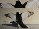 | シロートの一言。 ♂成鳥、TOPと同一個体です。 セグロセキレイの背の色味は♂♀かなり微妙で(明らかにそれとわかる淡色な♀もいます)、夏冬でも僅かな色味の違いがあるそうですが、正直そこまでは識別できずで、今のところは夏冬識別は諦めました。。。なお、右上合成写真のように初列雨覆が純白無班であれば♂確定で、風切羽暗色班も典型的な♂は初列風切だけで終わりますが、この個体のように外側の次列羽先まで黒班がつく♂もある程度普通にいるみたいです。 |