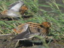 タシギの証し、最外側一対以外の全ての尾羽にオレンジ色班があります。他のジシギの尾羽にもこのオレンジ色班はありますが、これだけ外側尾羽まで広がっているのはタシギだけです。 |
