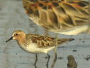 やや淡いものの成鳥夏羽だろうと思っていた個体ですが、ほぼ羽軸だけになった雨覆が写っていました。第1回夏羽としては最大限染まっていた個体なのではと推察です。