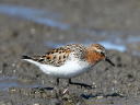 | シロートの一言。 成鳥夏羽、部分白化個体です。 うっすらとあるはずの過眼線もありませんから、単に顔の部分の夏羽換羽が遅れているというわけではないようです。まるで「ホオジロトウネン」ですね。けっこう可愛いのです。 |