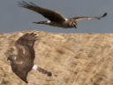 | シロートの一言。 幼鳥・若鳥のはずです。 ハイチュウの幼鳥に生まれ年の換羽はなく、生まれ年翌春から初めての換羽が始まってその年末くらいに全ての幼羽を換羽させているそうです。そして3〜4年目で成鳥になっているそうですが、♂幼鳥の虹彩は黄色っぽく、♀幼鳥の光彩は暗色で2年目以降黄色っぽくなるのだそうです。この個体の場合光彩は暗黄色か黄褐色で、♂ならば幼鳥、♀ならば2年目若くらいなのかなと??? |