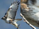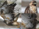 暗色虹彩で臑毛班がない、少し前までは♀成鳥と言われていたタイプです。しかしこの個体にも、ボロボロになった旧羽雨覆が混在しています。冬場の成鳥がこういう雨覆を持つことはありませんし、まだ2年目若鳥のはずです。 |