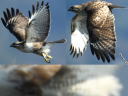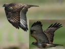 虹彩は暗色なものの、風切羽裏側後縁に暗色な羽先はなさそうに見えます。しかし、合成の飛翔写真の風切羽上面には濃淡があって、新旧の風切羽が混ざっているのだろうと推察できそうです。 |