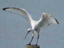 この個体も羽先黒班の多さで第1回冬羽だと思いながら撮っていたのですが、クチバシ上面に第1回冬や4月の第1回夏羽判断個体の赤味はなくで、直上「E92]同様渡去直前の第2回冬羽なのだろうと推察です。 |