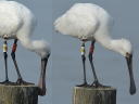 直上同様同一個体合成です。目の周囲説明を除いて直上同文ですが、下3月の「E92」写真を参照に、クロツラは第2回冬羽換羽でも幼羽同様各羽先に黒班がついた羽を換羽させているもようです。 |