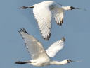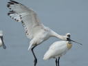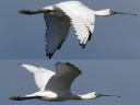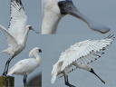 同一個体合成で一見ヘラサギのような顔ですが、目の周囲の皮膚が剥がれているだけでクロツラです。そして幼羽と変わらずの黒班が目立っていますが、たとえ側面からでもこのクチバシで9月の幼鳥はあり得ずで第2回冬羽です。 |